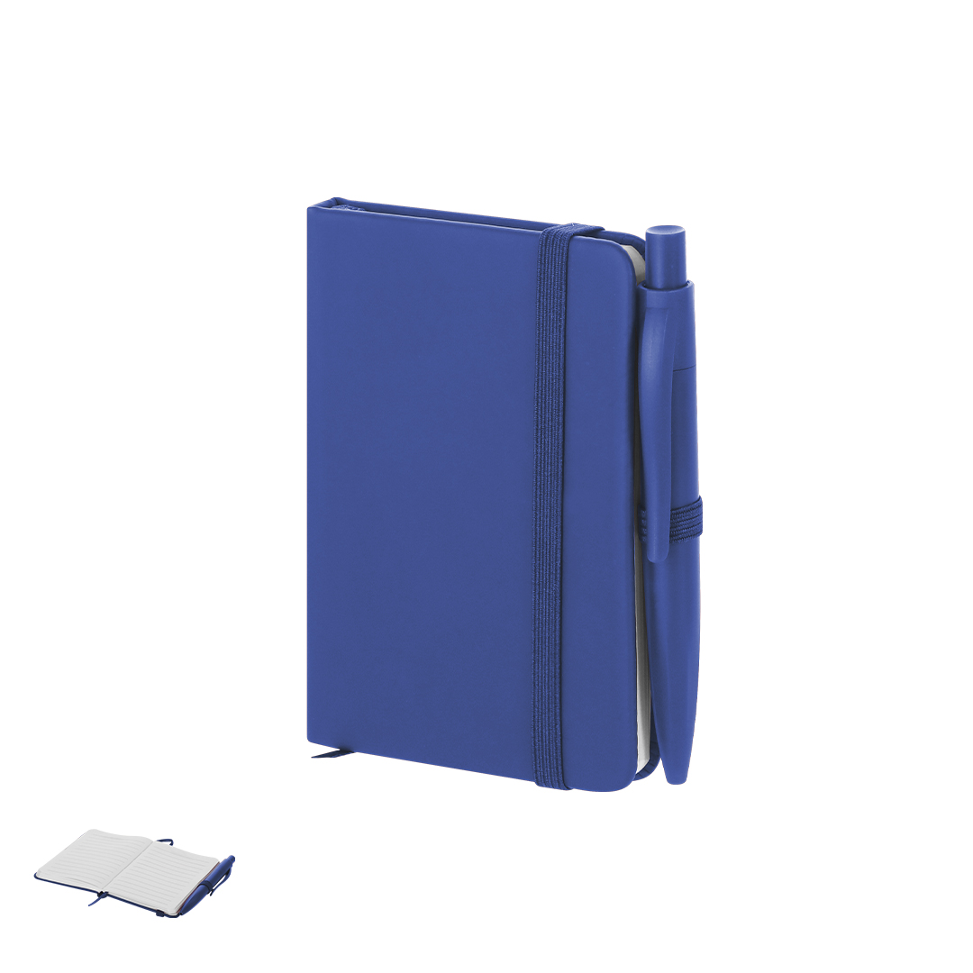 Bloc de notas con tapas rígidas en PU. Incluye 80 hojas en disposición de una raya, elástico de sujeción, marcapáginas de tela y bolígrafo a juego.