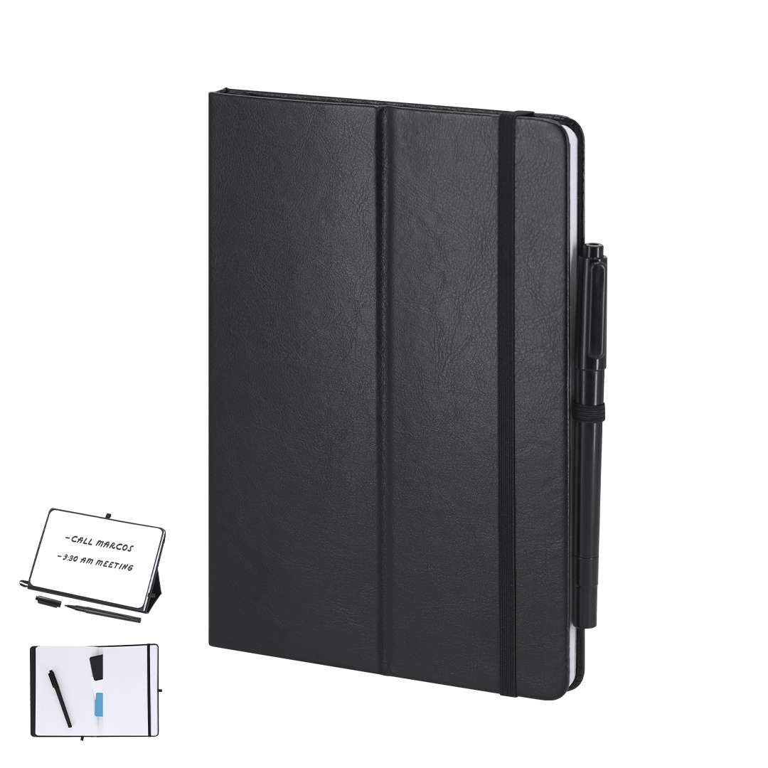Bloc de notas pizarra en PU reciclado. Con pizarra en primera página, incluye bolígrafo rotulador y borrador en tinta negra. Con 80 hojas a disposición de una raya. Portada plegable con función soporte, y cinta elástica para cierre seguro.Ideal para tomar notas rápidas, apuntes, crear diseños en tu jornada laboral o en casa.Incluye distintitov logo PU Reciclado.