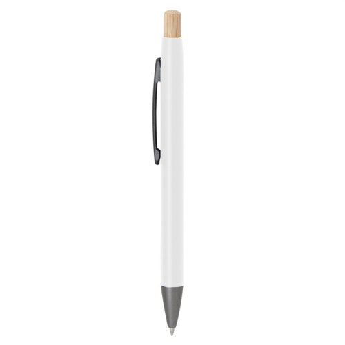 Bolígrafo retráctil. Cuerpo metálico en diferentes colores acabado mate. Clip metálico, puntera plástica color gris y pulsador de bambú.