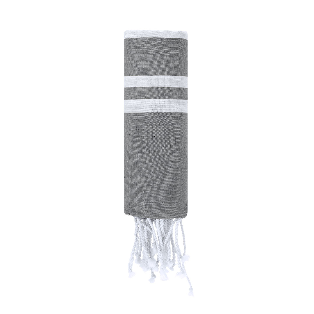 Suave pareo-toalla de 150g/m2 en combinación de algodón y poliéster. Su diseño cuenta con una base en color y rayas blancas, .Incluye flecos en los extremos que añaden un detalle decorativo y que completan su acabado.