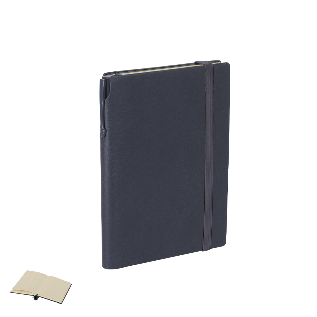 Set de bloc de notas y bolígrafo fabricados en PU reciclado y Aluminio Reciclado. El set incluye: - Bloc de notas fabricado en PU reciclada. Portadas rígidas, incluye 96 páginas de color crema, marcapáginas y cinta elástica de cierre a juego. Con distintivo logo PU reciclado. - Bolígrafo fabricado en Aluminio reciclado, con cuerpo en color sólido en acabado caucho. Dispone de clip, mecanismo pulsador y tinta azul. Incluye distintivo logo en Aluminio reciclado.El bloc dispone de un espacio para guardar el bolígrafo pudiendo llevarlo todo en un mismo sitio.