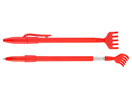 Bolígrafo plástico de color con tapa, con Manito Rascadora expansible (tipo antena). Escritura azul.