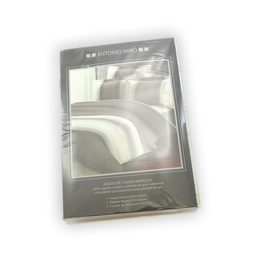 Juego nórdico de Antonio Miró de 4 piezas en material 100% algodón. Para colchones de 150x200cm, incluye edredón, dos fundas de almohada y bajera ajustable.
