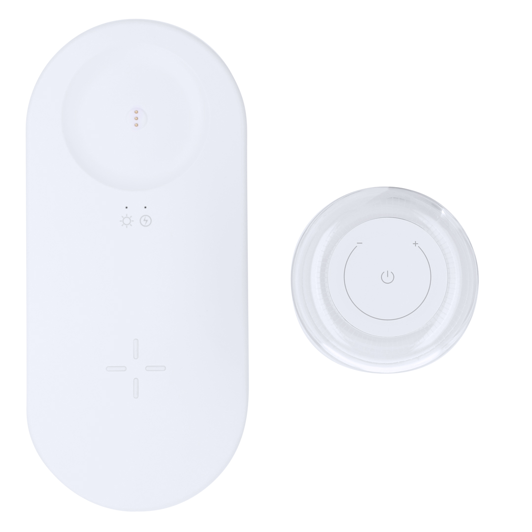 Lámpara multifunción. Incluye:- Lámpara portátil de carga inalámbrica de 12 LEDs. Con 2 posiciones de luz regulables por botones táctiles: luz blanca y multicolor. - Cargador inalámbrico de 15W. 12 Ledes. 2 Posiciones de Luz. Intensidad de Luz Regulable. Cargador Inalámbrico 15W. Conexión USB. Batería 600 mAh