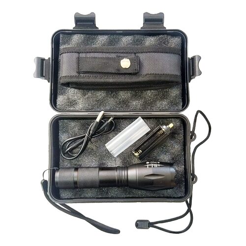 Batería de iones de litio 18650, 2000 mAh, Ø1,7 x 6,4 cms.Funda para batería Ø2 x 5,8 cms.Portapilas AAA, Ø2 x 6,3 cms.Cable de carga de 50 cmsFunda para linterna 4×20 cms.Caja de plásticoProductos relacionados