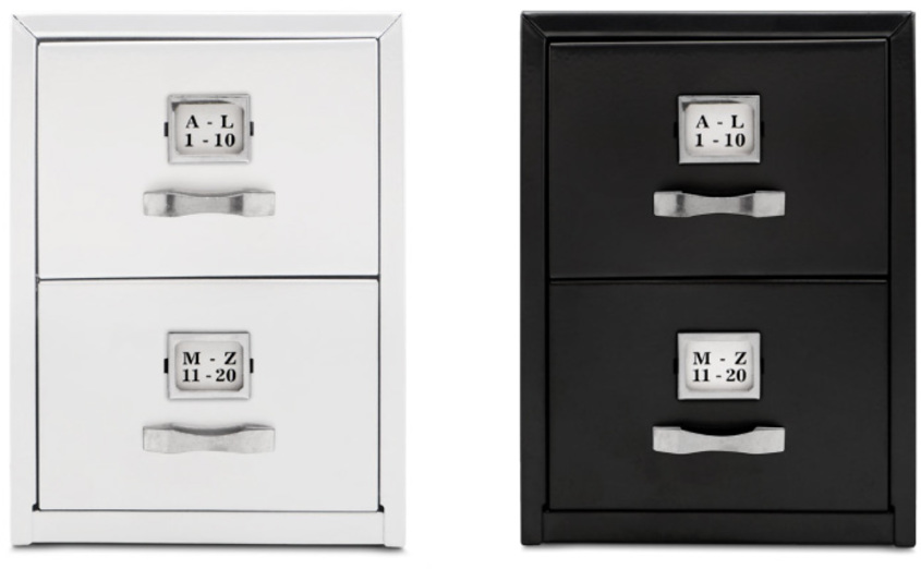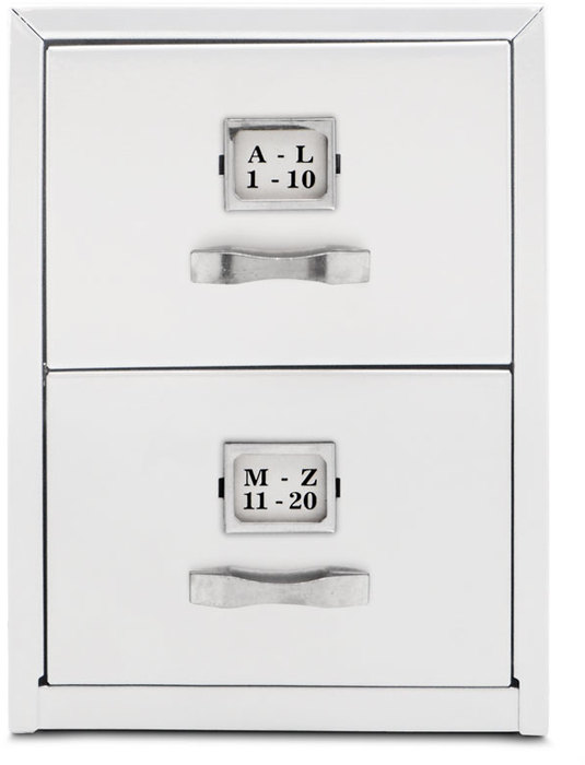 12 x 16 x 13 cm. Capacidad 800 tarjetas. Metal. Mini fichero metálico con dos cajones para archivar tarjetas, o para guardar objetos pequeños como clips, gomitas, chinches y ganchitos. Separadores con letra y número. Presentación en caja de regalo.