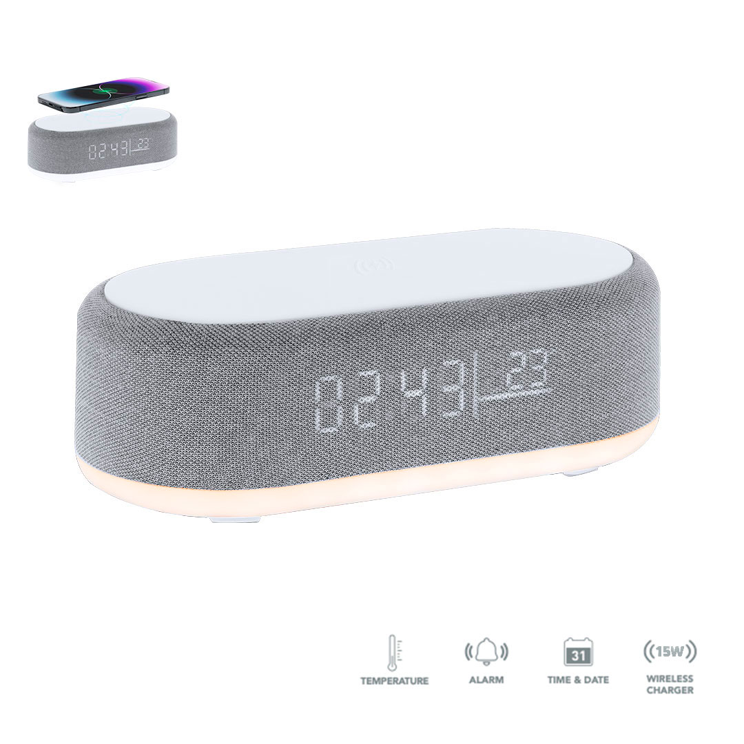 Reloj multifunción 5 en 1. Incluye múltiples funciones:-Cargador inalámbrico de 15W- Lámpara con luz cálida e intensidad regulable, ideal para crear ambientes agradables- Altavoz de 5W- Función hora (12/24h) y alarma- Indicador de temperatura y fechaCon pantalla retroiluminada y batería de 1200 mAh. Compatible con dispositivos equipados con tecnología de carga inalámbrica Qi. Fabricado en ABS blanco en combinación de poliéster. Con entrada USB Tipo C -cable incluido -. Lámpara 26 Ledes. Intensidad de Luz Regulable. Altavoz Conexión Bluetooth. Potencia Sonido 5W. Batería 1200 mAh. Cargador Inalámbrico 15W