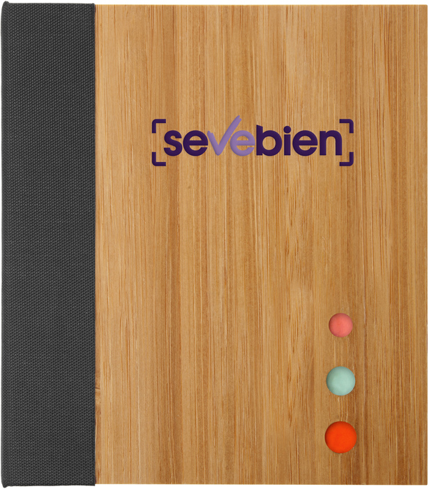 12 x 10,5 x 2 cm. Bambú. Contiene un bloc adhesivo rectangular de papel reciclado, un block adhesivo pequeño de color y 3 blocs en forma de flecha. El exterior del estuche es de bambú con detalles de tela, el interior es de plástico con divisiones.