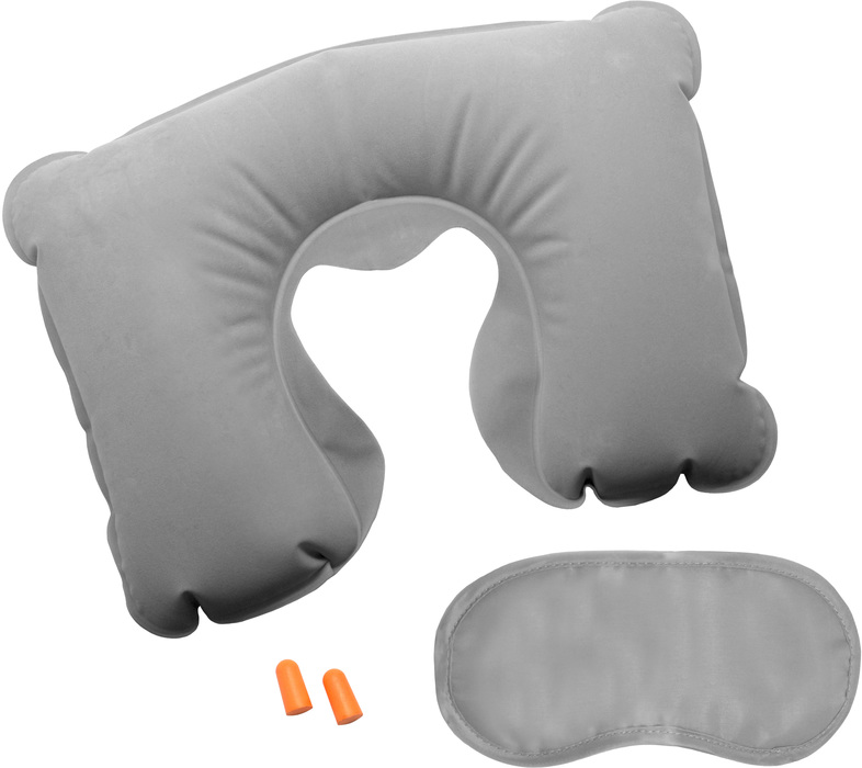 19,3 x 14,7 cm. Polyester. Set para viaje. Bolsa con bolsillo exterior, cierra ajustando los cordones. Contiene una almohada inflable de viaje, antifaz para dormir y tapones de oído para dormir.