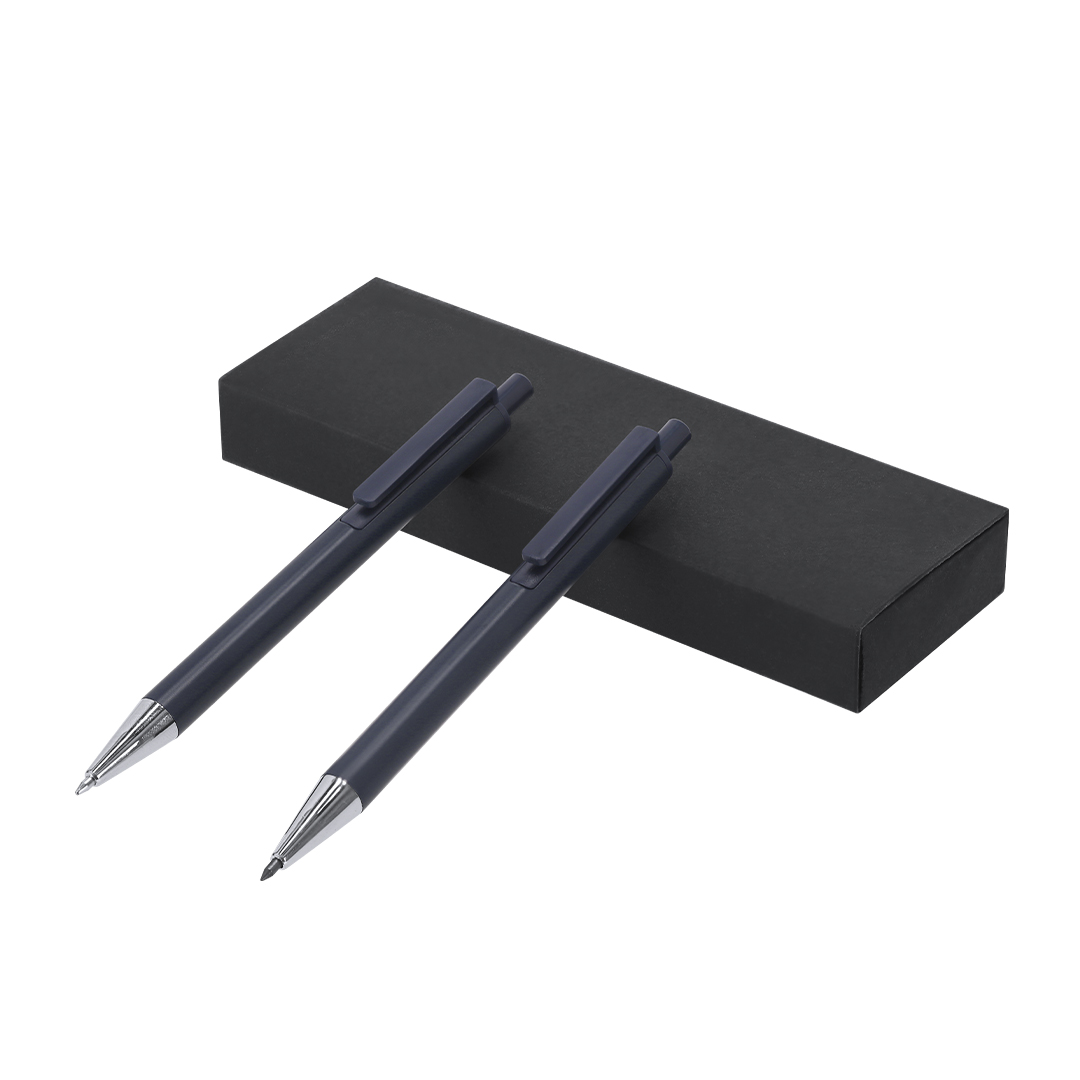 Set compuesto por un bolígrafo de tinta azul y un lápiz eterno, fabricados en Aluminio Reciclado. El lápiz eterno ofrece escritura continua, evitando generar residuos. Ambos cuentan con mecanismo pulsador. Diseñados con clip a juego y detalles cromados. Presentados en estuche de cartón reciclado de color negro. Con distintivo de AL Recycled impreso.