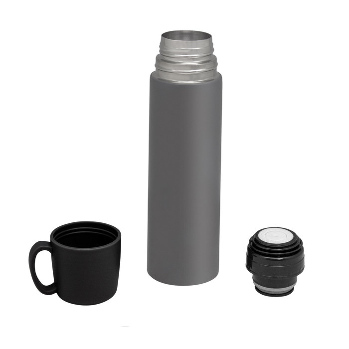 8,1 x 6,8 x 25 cm. Capacidad 500 ml. Acero inoxidable y Polipropileno. Termo con doble pared sellado al vacío. Acero inoxidable 304 interior / 201 exterior. Tapa y taza plásticas en color negro. Pintura acabado mate. Presentación en caja de regalo Kraft.